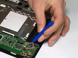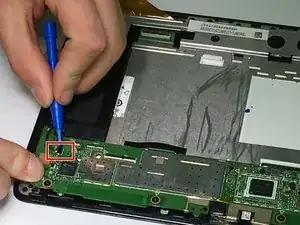 Отсоедините кабель динамика, осторожно подталкивая его параллельно материнской плате плоской стороной синего пластикового инструмента для открытия.