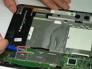 Снимите шлейф, обозначенный как CN1, осторожно поднимая белый зажим черных и белых разъемов с помощью маленького синего пластикового инструмента для открытия.