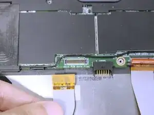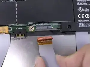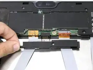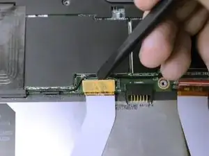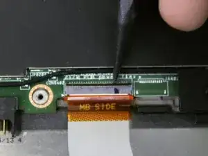 Правый ленточный кабель имеет ZIF-разъём. Используйте плоский конец лопатки, чтобы поднять небольшой фиксирующий язычок, затем вытяните кабель.