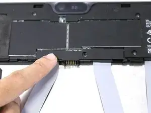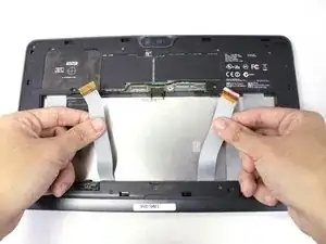 Между устройством и двумя отсоединёнными ленточными кабелями находятся клейкие полосы. Оттяните каждый кабель от устройства лишь настолько, чтобы разорвать клейкие соединения.