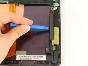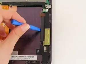 Отключите ленточный кабель, поместив пластиковый инструмент под чёрную пластиковую защёлку, которая находится на противоположной стороне порта от самого ленточного кабеля.