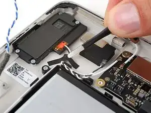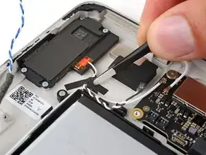 Используйте пинцет с тупыми концами или пальцы, чтобы отклеить и удалить ленту, фиксирующую чёрно-белый кабель динамика к корпусу.