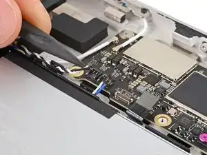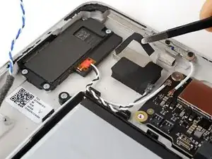 Используйте кончик лопатки, чтобы поднять и отключить разъём синего и белого кабеля динамика с левой стороны системной платы.