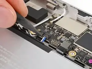Используйте пинцет с тупыми концами или пальцы, чтобы отклеить и удалить три полоски ленты, фиксирующие кабель порта USB-C к батарее.