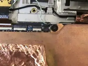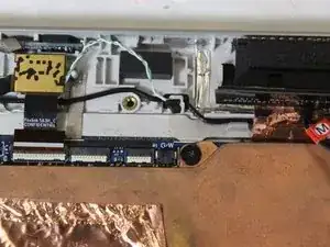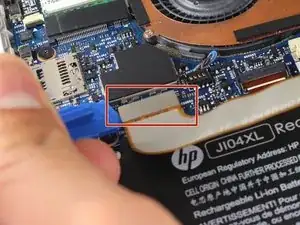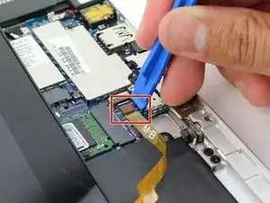 Снимите два разъёма на задней стороне экрана, приподняв защёлки разъёмов на материнской плате пластиковой монтажной лопаткой и аккуратно потянув.