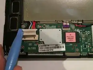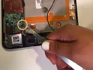 С помощью пластикового инструмента для вскрытия отсоедините пластиковую деталь, соединяющую провода с платой.