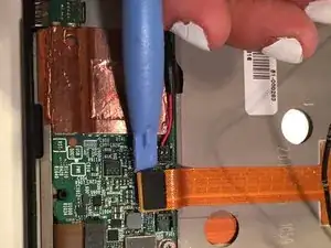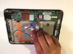 Как только все пластиковые защёлки, удерживающие экран и пластиковую заднюю панель Kindle Fire, будут разъединены, заднюю крышку можно полностью снять.
