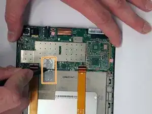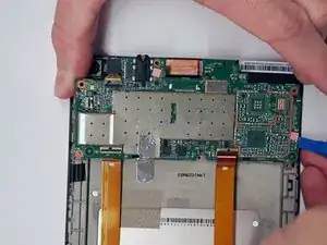 Возможно, батарея приклеена к корпусу. Используйте лопатку, чтобы отделить клей, пока батарея частично приподнята картой.