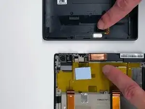 Провод нижнего динамика приклеен к задней крышке устройства, поэтому при его снятии будьте осторожны.