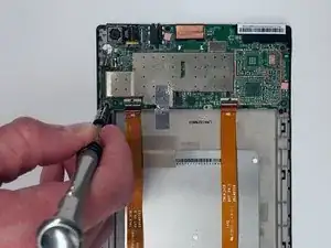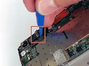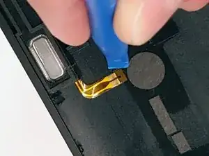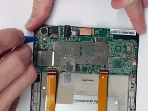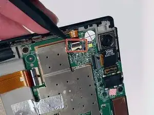 Снимите прижимаемый кабель рядом с камерой, аккуратно поддев его инструментом для вскрытия.