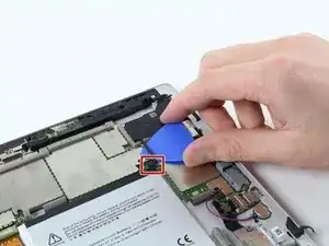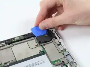 Используйте медиатор, чтобы поддеть часть динамика и отклеить клей, удерживающий его на задней крышке.