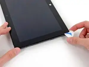 Рамка с нижней стороны дисплея (стороны с логотипом Windows) значительно тоньше. Чтобы избежать повреждений, не вставляйте открывалку слишком глубоко по нижнему краю.