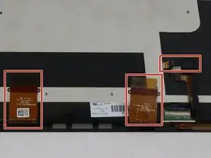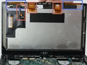Осторожно отклейте от рамы два оранжевых ленточных кабеля, приклеенных к ней, так как они должны остаться на дисплее. (например, используйте тонкую пластиковую карту, чтобы отделить их)