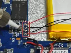 С помощью паяльного инструмента удалите два маленьких черных провода и два маленьких красных провода с материнской платы.