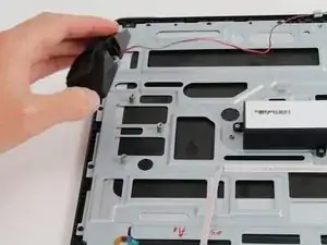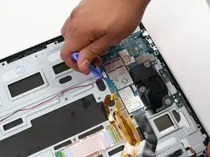 Используйте пластиковый инструмент для вскрытия, чтобы отсоединить белый собранный кабельный разъём, который соединяет левый динамик с платой через красный провод.