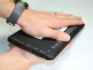 После того как вы вынули винты из нижней части планшета, снимите крышку, сдвинув её. Для этого положите руку на панель и сильно сдвиньте панель в направлении, указанном стрелкой.