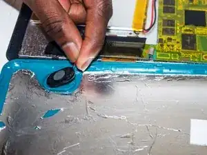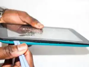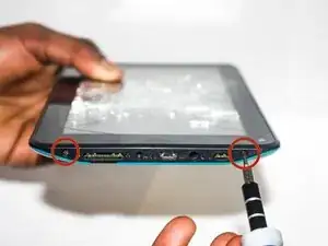 Используя пластиковый инструмент, вставьте его между задней панелью и экраном, начиная с угла справа от кнопки питания, и начните отделять заднюю крышку.