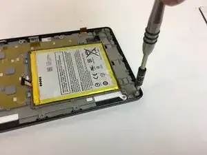 Открутите шесть чёрных винтов, расположенных вокруг аккумулятора и динамика, с помощью отвёртки T5 Torx.