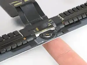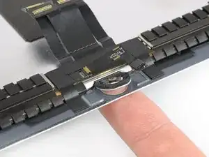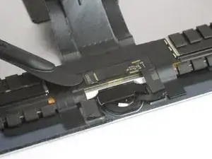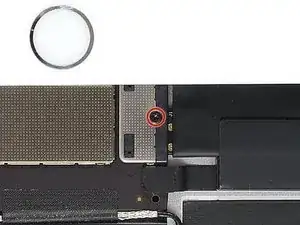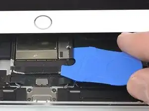 Используйте кончик лопаточки, инструмент для открывания или ноготь, чтобы поднять маленькую шарнирную фиксирующую лапку на ZIF-разъёме кабеля кнопки «Домой».