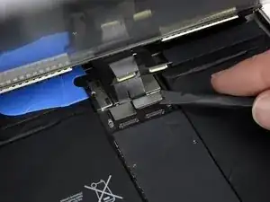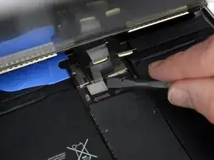 Используйте лопаточку, чтобы отсоединить два видимых гибких разъёма дисплея, осторожно поддев их прямо вверх из розеток.