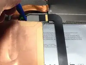 Разъём шлейфа слева закрыт лёгким металлическим кожухом. Подденьте по краям этот кожух пластиковым плоским инструментом. Как только он ослабнет, снимите его.