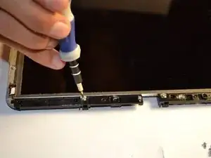Используйте отвертку T6, чтобы выкрутить 17 винтов длиной 4 мм. Они расположены по периметру планшета.