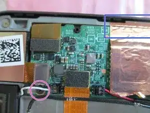 Чтобы снять аккумулятор, поднимите его вверх и отведите от Kindle, затем вытяните кабель из материнской платы.