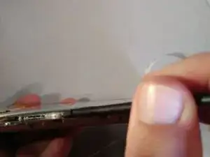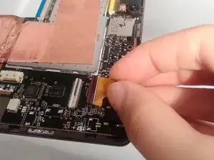 Поднимите серую фиксирующую защёлку на ZIF-разъёме белого лентового кабеля на материнской плате ногтем. Если у вас ногти недостаточно длинные, аккуратно используйте чёрную пластиковую лопатку.