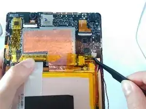 Найдите и аккуратно удалите жёлтую целлофановую ленту пинцетом с разъёма аккумулятора и с чёрного и красного проводов динамика на краю материнской платы.