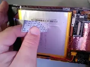 Удалите белый лентовый кабель и аккуратно оторвите его от аккумулятора.