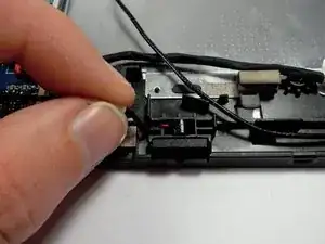 С помощью пластиковой распорки отключите чёрный кабель, поместив лопатку под место соединения кабеля с разъёмом, и приподнимите.