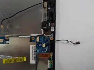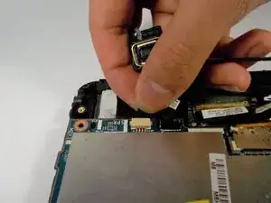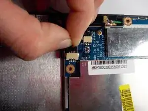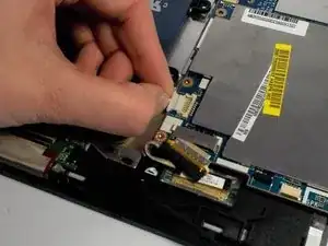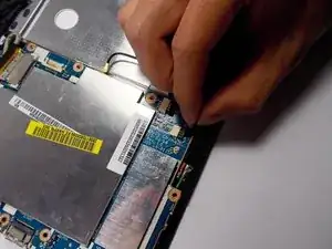 После отключения зелёного кабеля удалите чёрную ленту, фиксирующую кабель на материнской плате.