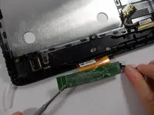 С помощью пластиковой распорки отключите зелёный кабель, поместив лопатку под место соединения кабеля с разъёмом и приподнимите.