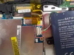 Поднимите аккумулятор и отключите кабель, подключённый к материнской плате, потянув его в сторону, не поднимая вверх.