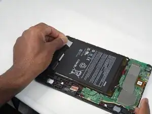 Медленно и аккуратно тяните и удаляйте три клейкие ленты под старым аккумулятором.