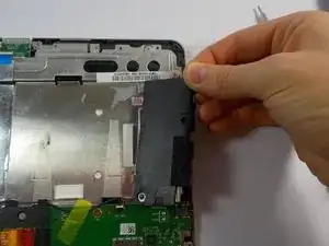 Отсоедините ленточный кабель камеры от нижней стороны материнской платы, затем снимите материнскую плату.