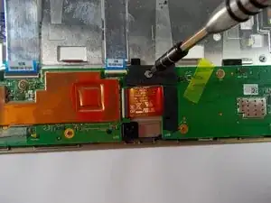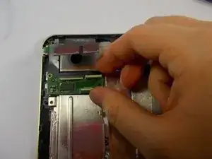 Удалите чёрный скотч с материнской платы. Отсоедините ленточный кабель, идущий к кнопкам громкости и питания.