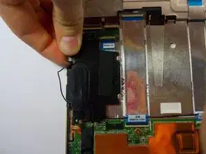 Снимите жёлтый скотч и отключите провод, соединяющий динамики с звуковой платой.