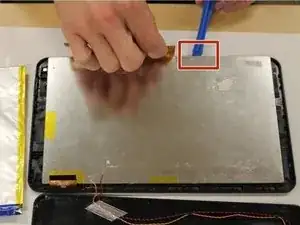 Используя металлическую лопаточку, вставьте её между аккумулятором и металлической частью экрана.