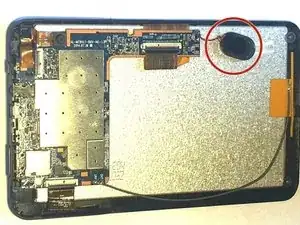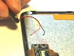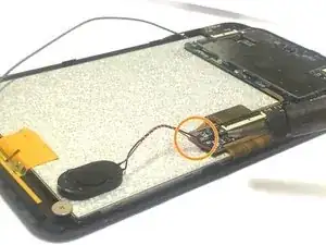 Положите устройство и обратите внимание, что динамик будет прикреплён к задней крышке проводом. Осторожно поднимите динамик вверх от задней крышки и положите его рядом с батареей.