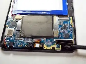После удаления всех винтов и отключения проводов используйте синюю пластиковую лопаточку и, начиная снизу рядом с аккумулятором, аккуратно приподнимите заднюю металлическую пластину вместе с материнской платой. Отложите их в безопасное место.