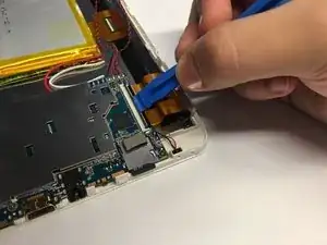 Используя пластиковый инструмент для открывания, приподнимите защёлку, фиксирующую правую сторону материнской платы к шлейфу экрана.