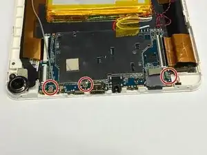 С помощью биты Philips J0 выкрутите три винта 1 мм, крепящие материнскую плату, как показано. Снимите все три винта и отложите их в сторону.