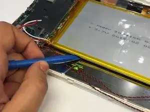 Используя пластиковый инструмент для открывания, аккуратно снимите желтую ленту, удерживающую аккумулятор на месте.
