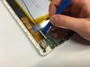 Используя пластиковый инструмент для открывания, приподнимите защёлку, фиксирующую левую сторону материнской платы к шлейфу экрана.