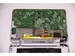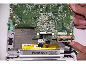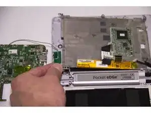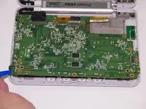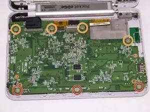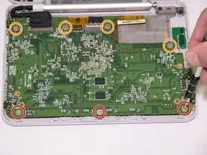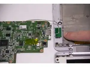 Материнская плата теперь соединена только в одном месте на краю устройства. Учитывая это, выверните материнскую плату наружу, оставив её соединённой с пенопластовой прокладкой внутри устройства.