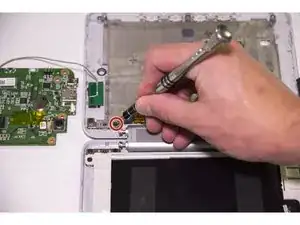С помощью отвертки J0 с крестообразным шлицем выкрутите один винт 5 мм, удерживающий серую пластиковую заднюю панель экрана ридера.