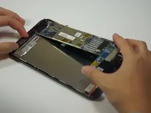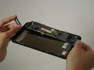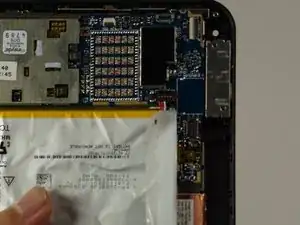 С помощью лопатки отключите материнскую плату от задней камеры, передней камеры, антенны, платы кнопки питания, экрана и панели дисплея.