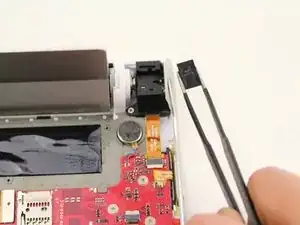 Снимите провод с печатной платы, потянув его к краю разъёма для наушников с помощью пинцета.