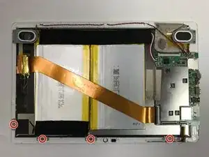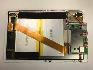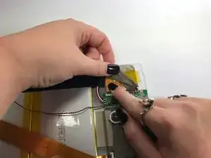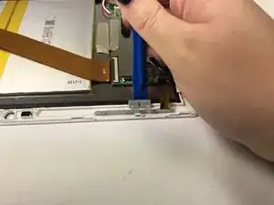 Кнопка регулировки громкости и кнопка питания, расположенные на верхнем торце рядом с камерой, не являются цельными частями и освободятся из устройства после снятия передней панели с задней крышки. Их легко вернуть на место при сборке планшета.